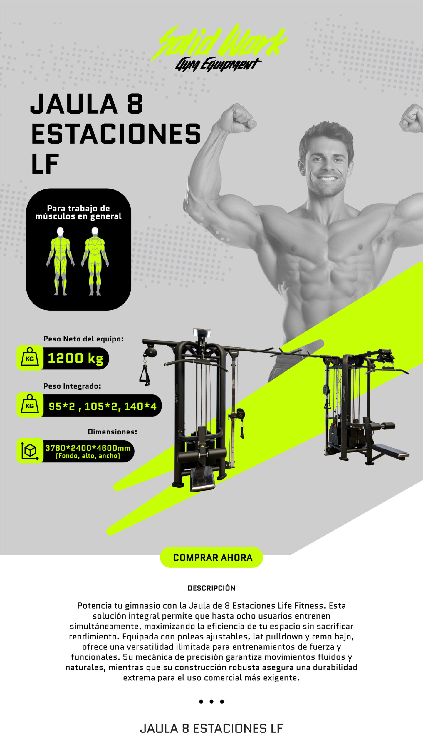 Potencia tu gimnasio con la jaula de 8 estaciones.  Esta solución integral permite que hasta ocho usuarios entrenen simultáneamente, maximizando la eficacia de tu espacio sin sacrificar rendimiento           Descargar Ficha Técnica