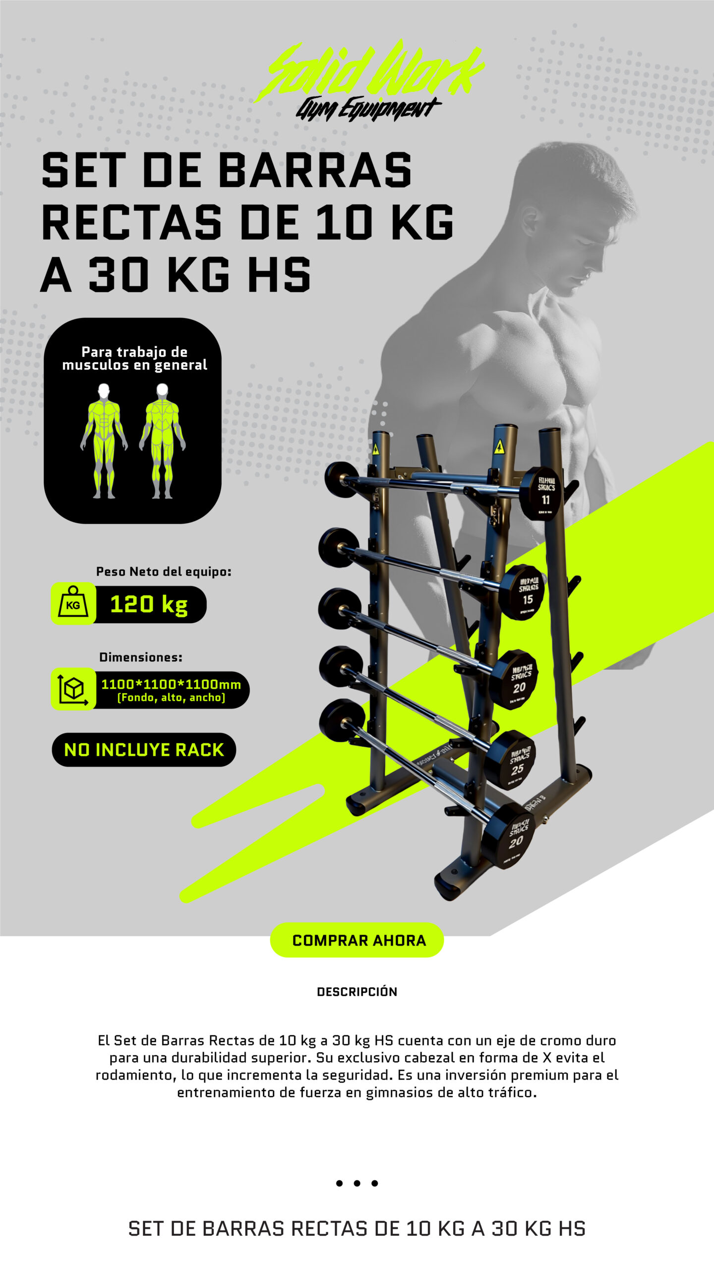 Eleva tu zona de peso libre con el set de barras rectas HS, cubriendo un rango de 10 a 30 kg.         Descargar Ficha Técnica